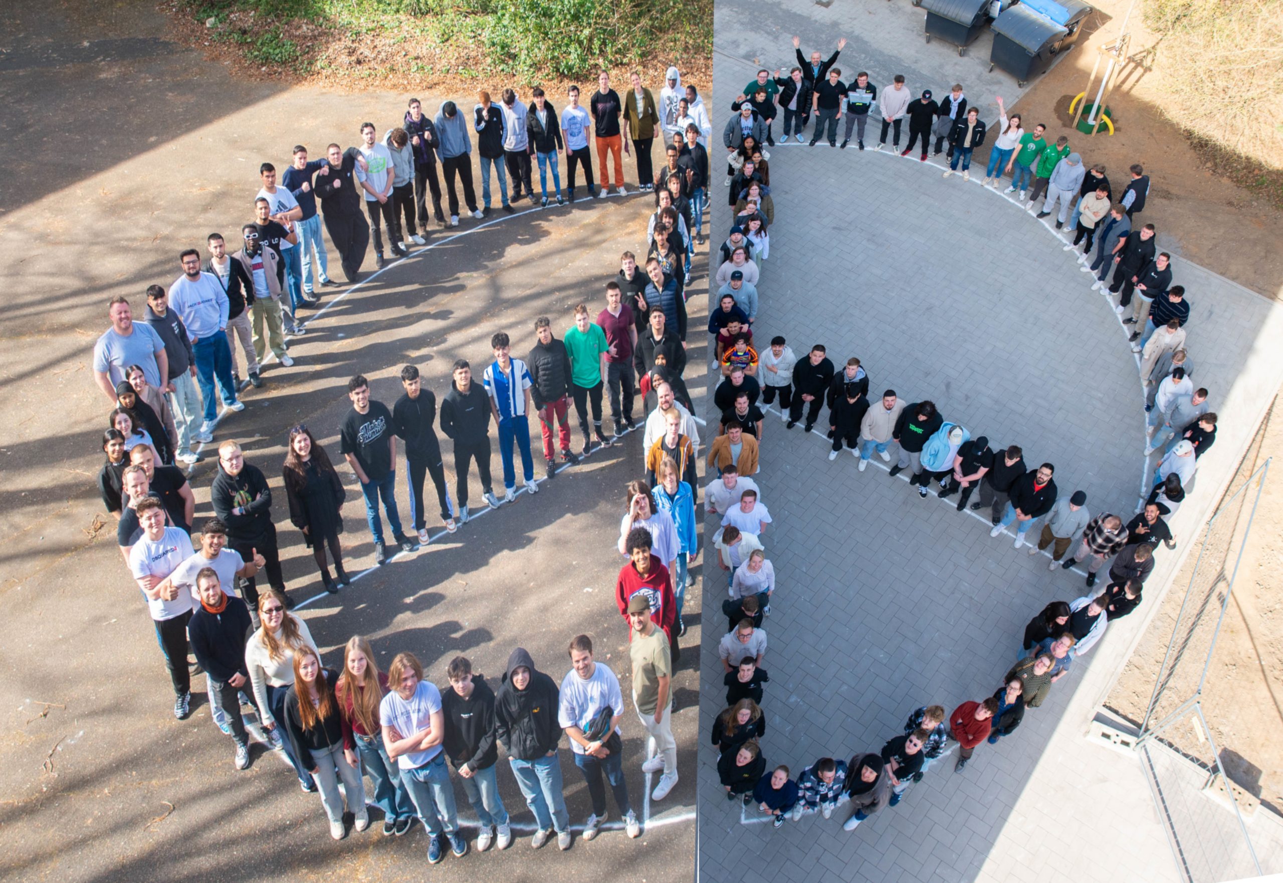 An unseren beiden Schulstandorten in Köln Porz und Köln Deutz wurde jeweils aus der Vogelperspektive ein halbes Peace-Zeichen fotografiert und anschließend zusammengefügt – als Symbol für Zusammenhalt, Vielfalt und den gemeinsamen Einsatz gegen Diskriminierung.