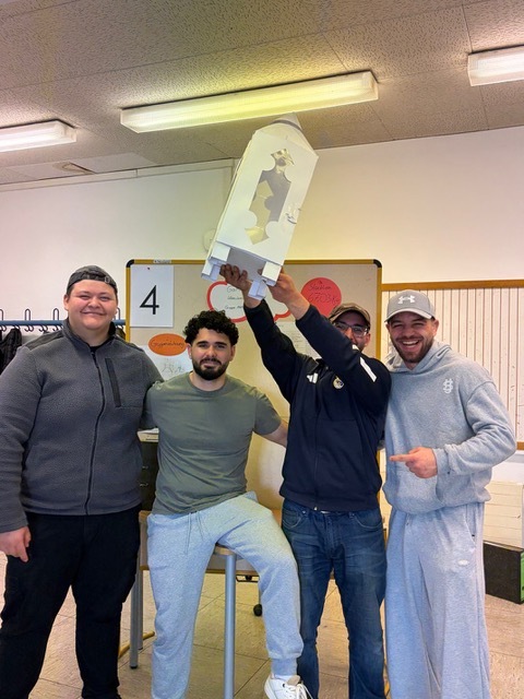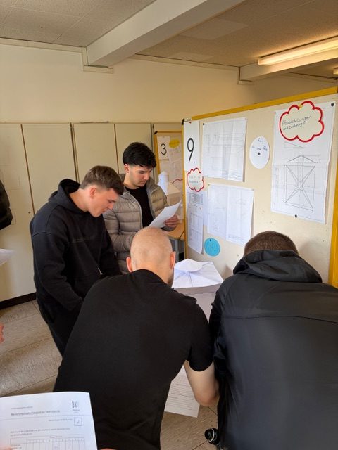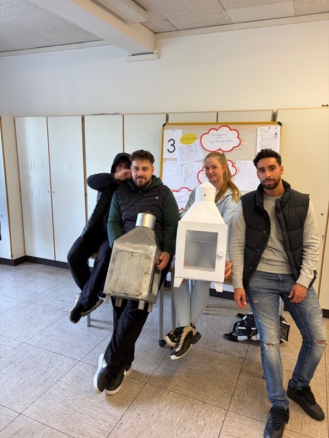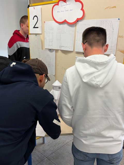 Über 3 Schulblöcke erstellten die einzelnen Gruppen Zeichnungen, Abwicklungen und die Fertigungsplanung. Und heute war der große Tag der Präsentation- als Gast wurde eine Klasse der Berufsvorbereitung eingeladen. Die Azubis erklärten ihre Ideen und Entwürfe
